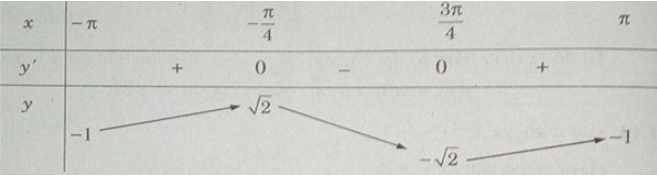 Do đó trên đoạn [0;π] , hàm số đạt cực đại tại π/4 , đạt cực tiểu tại 3π/4 và yCD = y(π/4) = 1; yCT = y(3π/4) = −1