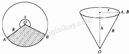 Cắt bỏ hình quạt AOB (hình phẳng có nét gạch trong hình 1.3) từ một mảnh các tông hình tròn bán kính R rồi dán hai bán kính OA và OB của một hình quạt còn lại với nhau để được một cái phễu có dạng một hình nón. Gọi x là góc ở tâm của hình quạt tròn dùng làm phễu (h.1.3), \(0 < x < 2\pi \)