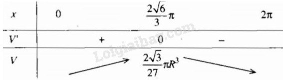 \(\mathop {\max }\limits_{x \in \left( {0;2\pi } \right)} V = V({{2\sqrt 6 \pi} \over 3}) = {{2\sqrt 3 } \over {27}}\pi {R^3}\)