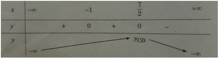 \(y’ = 0 \Leftrightarrow \left[ \begin{array}{l}x =  – 1\\x = \dfrac{7}{2}\end{array} \right.\)
