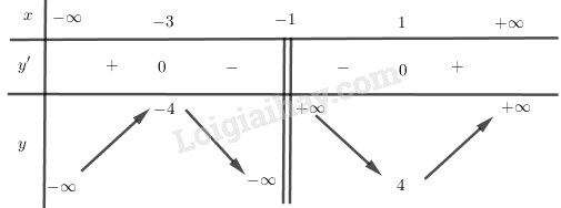 \(\mathop {\lim }\limits_{x \to {{\left( { – 1} \right)}^ + }} y =  + \infty ,\mathop {\lim }\limits_{x \to {{\left( { – 1} \right)}^ – }} y =  – \infty \) nên TCĐ: \(x =  – 1\).