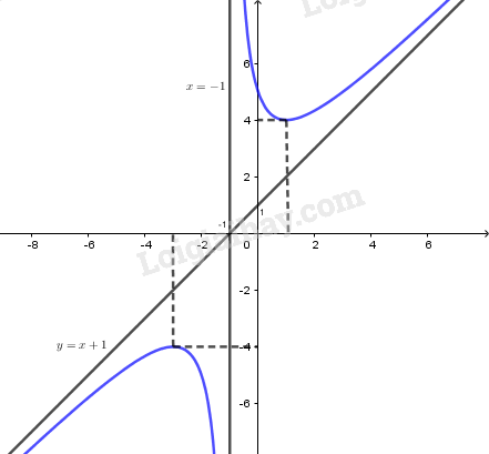 \(\mathop {\lim }\limits_{x \to  \pm \infty } \left[ {y – \left( {x + 1} \right)} \right] = \mathop {\lim }\limits_{x \to  \pm \infty } \frac{4}{{x + 1}} = 0\) nên TCX: \(y = x + 1\).