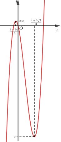 Hàm số đạt cực đại tại \(x = \frac{{4 – 2\sqrt 7 }}{3}\), đạt cực tiểu tại \(x = \frac{{4 + 2\sqrt 7 }}{3}\)