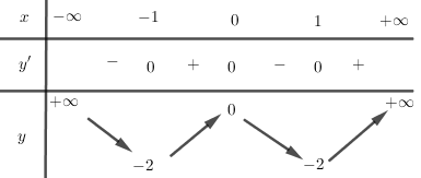 Hàm số đạt cực tiểu tại \(x =  \pm 1;{y_{CT}} =  – 2\)