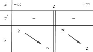 \(\mathop {\lim }\limits_{x \to {2^ + }} y =  + \infty ,\mathop {\lim }\limits_{x \to {2^ – }} y =  – \infty \) nên TCĐ \(x = 2\).