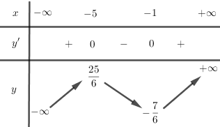 Ta có: \(y’ = \dfrac{{{x^2}}}{2} + 3x + \dfrac{5}{2}\);\(y’ = 0 \Leftrightarrow {x^2} + 6x + 5 = 0 \Leftrightarrow \left[ \begin{array}{l}x =  – 1\\x =  – 5\end{array} \right.\)