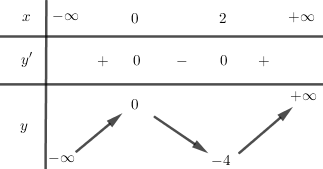 Hàm số đạt cực tiểu tại \(x = 2;{y_{CT}} = y\left( 2 \right) =  – 4\).