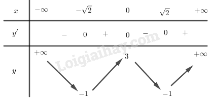 Hàm số đạt cực tiểu tại \(x =  \pm \sqrt 2 ,{y_{CT}} =  – 1\).