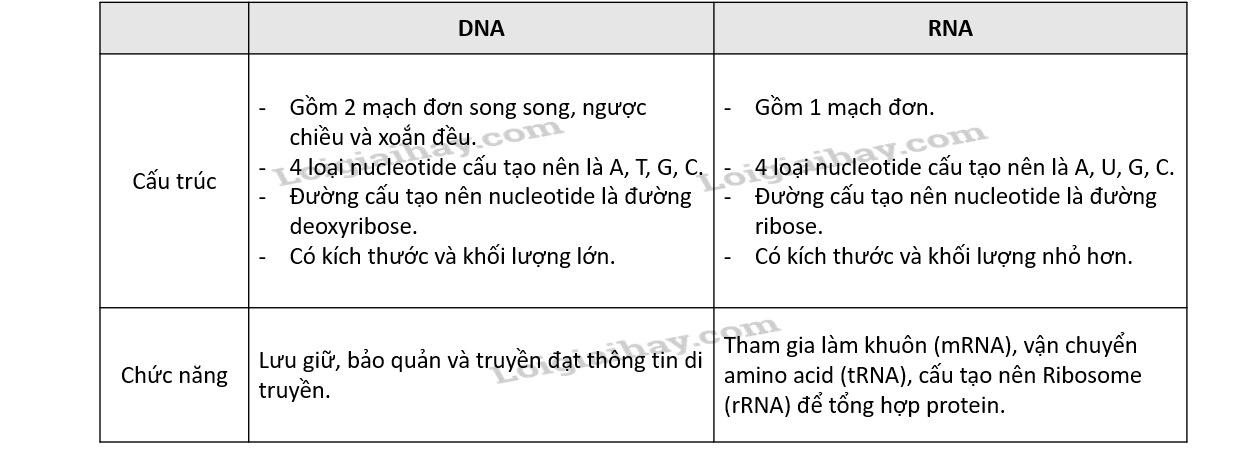 Giải bài 1 mục III Củng cố hoàn thiện trang 41 VBT Sinh học 9: Nêu những điểm khác nhau cơ bản trong cấu trúc của ARN và ADN.