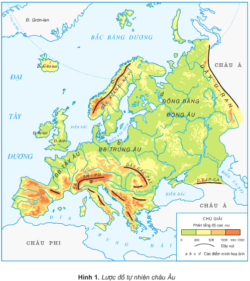 Dựa vào hình 1, hãy xác định: vị trí địa lí, giới hạn của châu Âu, vị trí các dãy núi và đồng bằng của châu Âu.