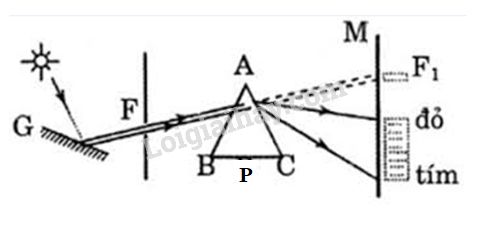 – Trong thí nghiệm, gương G đùng để phản chiếu ánh sáng Mặt Trời qua một khe hẹp F, nằm ngang, vào một buồng tối. Nhờ các hạt bụi nhỏ ta nhìn thấy vết của chùm sáng song song hẹp, qua F. Đặt một màn M song song với F và cách F chừng một hai mét để hứng chùm sáng, thì trên màn ta thấy một vệt sáng F1 màu trắng, giống như khe F. Đặt một lăng kính thuỷ tinh P giữa F và F1 cho cạnh khúc xạ của P song song với F, sao cho chùm sáng rọi xiên vào mặt AB, ta thấy vệt sáng F1 trên màn bị dịch xuống phía đáy lăng kính, đồng thời bị trải dài thành một dải màu sặc sỡ.