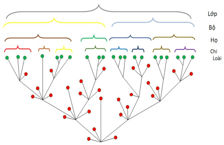 Các nhóm loài trên cùng một cành gốc nhỏ có chung một số đặc điểm (họ hàng gần) có thể coi như thuộc cùng một chi, nhiều cành gốc có chung những đặc điểm nhất định gộp lại thành một đơn vị phân loại lớn hơn (họ, bộ, lớp, ngành…) và cứ thế tiếp tục.