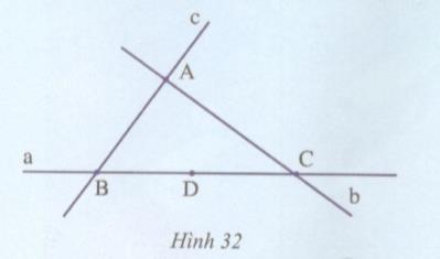 d) Điểm D không nằm trên đường thẳng c và b: \(D \notin c,D \notin b\)