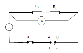 + Công thức tính điện trở tương đương của đoạn mạch mắc nối tiếp \({R_{1}} + {\rm{ }}{R_2} = {\rm{ }}{R_{td}}\)