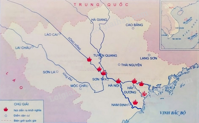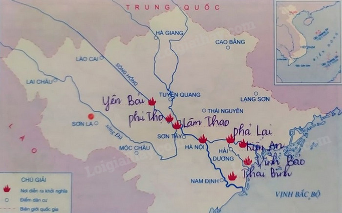 Giải bài 1 trang 21 tập bản đồ Sử 9. Dựa vào nội dung SGK và lược đồ dưới đây, em hãy điền vào chỗ chấm những địa danh nổ ra khởi nghĩa Yên Bái