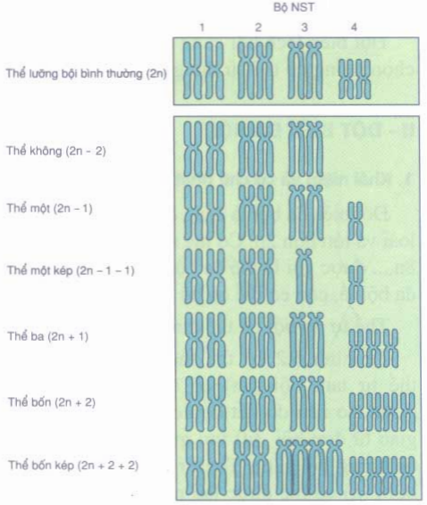 Ở sinh vật lưỡng bội, đột biến lệch bội thường có dạng chính như thể không (2n – 2); thể một (2n – 1); thể một kép (2n – 1 – 1); thể ba (2n +1 ); thể bốn (2n + 2); thể bốn kép (2n + 2 + 2 ).