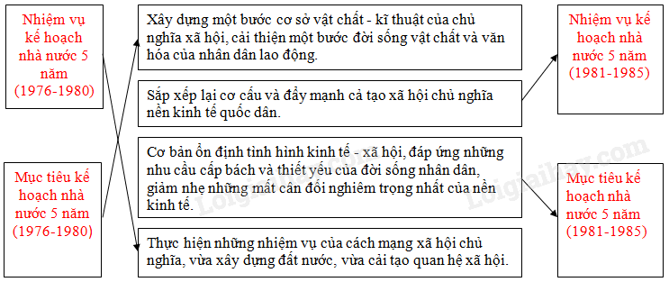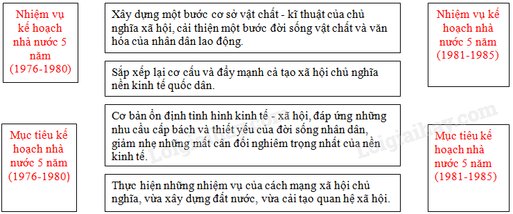 Dựa vào nội dung bài học, em hãy nối những thông tin trong khung màu xanh với những thông tin trong khung màu đỏ để thấy được nhiệm vụ và mục tiêu cơ bản của từng kế hoạch Nhà nước 5 năm trong gian đoạn từ năm 1976 đến năm 1980.