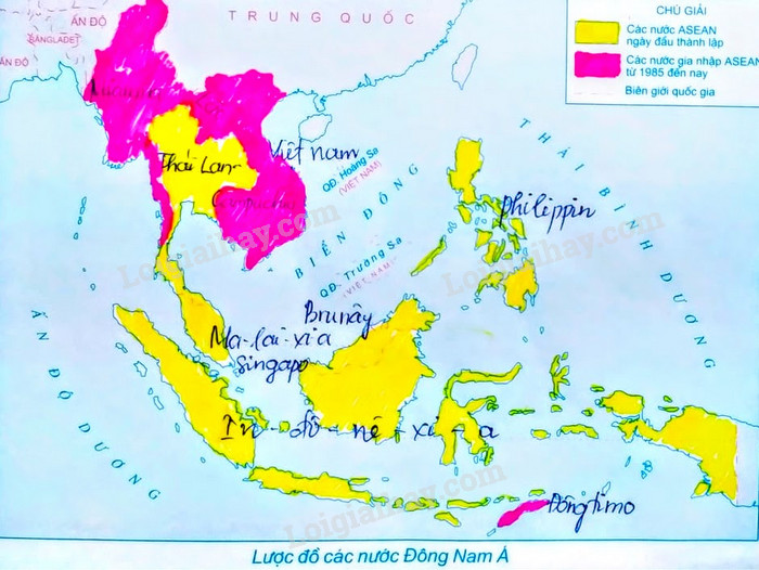 – Tô màu vàng vào lãnh thổ các nước thuộc ASEAN từ ngày đầu thành lập; màu hồng vào lãnh thổ các nước gia nhập ASEAN từ năm 1985 đến nay.