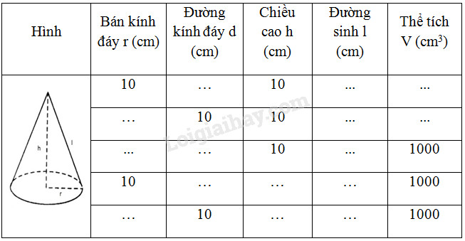 + Khi \(d = 10cm\) và \(h = 10cm\), ta có \(r = 5cm\);