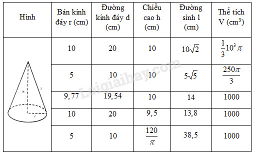– Chiều cao \(h = \dfrac{{3V}}{{\pi {r^2}}} = \dfrac{{3.1000}}{{\pi {{.10}^2}}} = 9,5\left( {cm} \right);\)