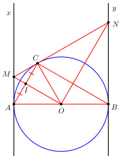 c) MC cắt tiếp tuyến By của đường tròn (O) tại N. Chứng minh rằng : MN = AM + BN và số đo góc MON bằng \({90^o}\).