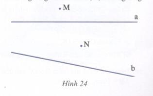 Trong hình 24, hãy nêu cách vẽ điểm A thuộc đường thẳng a và điểm B thuộc đường thẳng b sao cho ba điểm A, M, N thẳng hàng và ba điểm M, B, N thẳng hàng.