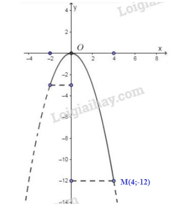 Vẽ parabol đi qua gốc tọa độ và các điểm có tọa độ \(\left( { – 4; – 12} \right);\left( { – 2; – 3} \right);\left( {2; – 3} \right);\left( {4; – 12} \right)\) ta được đồ thị hàm số \(y =  – 0,75{x^2}\)