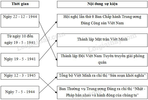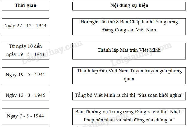 Nối các ô thời gian với các ô nội dung sự kiện, sao cho đúng.