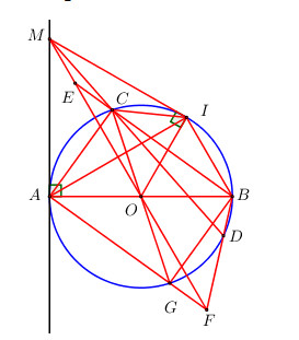 Cho đường tròn (O) đường kính AB. Từ điểm M khác điểm A trên tiếp tuyến với đường tròn tại A, ta vẽ cát tuyến MCD (C nằm giữa M và D). Vẽ tiếp tuyến MI tiếp xúc với (O) tại I. Đường thẳng BC và BD cắt đường thẳng OM tại E và F. Chứng minh: