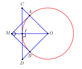 b) Qua giao điểm I của đoạn MO và đường tròn (O), vẽ một tiếp tuyến với (O) cắt OA, OB tại C và D. Tính CD.