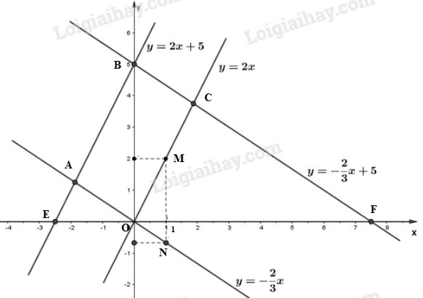 a) Vẽ đồ thị của các hàm số \(y = 2x;\,\,y = 2x + 5;\,\,y =  – \dfrac{2}{3}x;\)\(y =  – \dfrac{2}{3}x + 5\) trên cùng một mặt phẳng tọa độ.