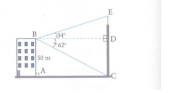 Từ nóc một cao ốc cao 50 m người ta nhìn thấy chân và đỉnh một cột ăng-ten với các góc hạ và nâng lần lượt là \({62^o}\) và \({34^o}\). Tính chiều cao của cột ăng-ten.