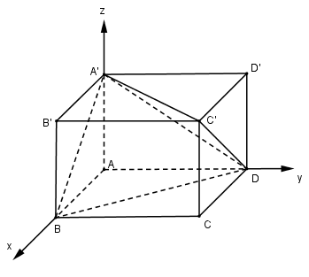 Ta có: \(A’\left( {0;0;c} \right),\,\,B\left( {a;0;0} \right),\,\,D\left( {0;b;0} \right).\)