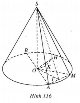 Vì OH \( \bot \) mp(SAM) nên OH \( \bot \) SA. Vậy H thuộc mp(P) đi qua O và vuông góc với SA tại K. Ta có (P) là mặt phẳng cố định, ngoài ra \(\widehat {OHK} = {90^0}\), tức là H thuộc đường tròn đường kính OK trong mặt phẳng (P) nêu trên, tất nhiên đường tròn này cố định.