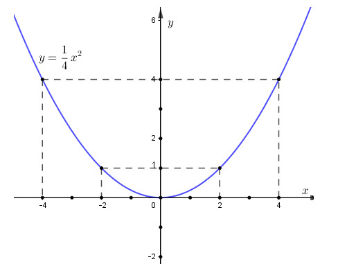 Vậy đồ thị hàm số \(y = \dfrac{1}{4}{x^2}\) là parabol và đi qua các điểm có tọa độ là \(\left( { – 4;4} \right);\left( { – 2;1} \right);\left( {0;0} \right);\left( {2;1} \right);\left( {4;4} \right)\)