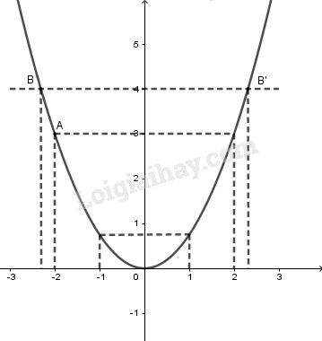Từ điểm có tung độ \(y = 4\) kẻ đường thẳng song song với trục hoành cắt đồ thị tại \(B\) và \(B’\) là điểm có tung độ \(y = 4.\)