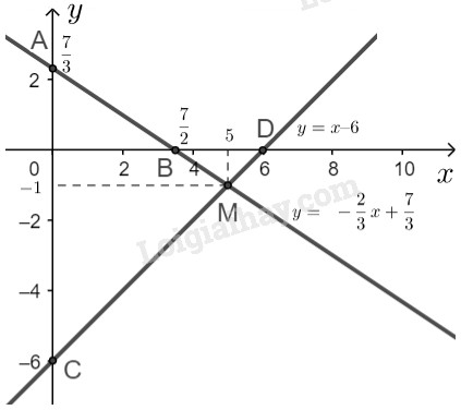 – Quan sát hình vẽ, ta thấy hai đường thẳng \(y =   \displaystyle – {2 \over 3}x + {7 \over 3}\) và \(y = x – 6\) cắt nhau tại điểm \(M (5; -1).\)