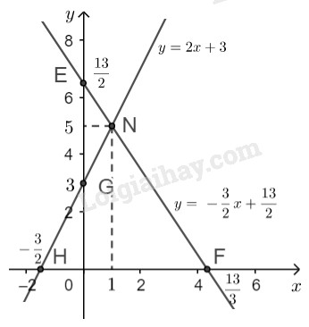 – Quan sát hình vẽ, ta thấy hai đường thẳng \(y = \displaystyle – {3 \over 2}x + {{13} \over 2}\) và \(y = 2x + 3\) cắt nhau tại điểm \(N (1;5).\)