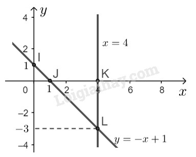 – Quan sát hình vẽ, ta thấy hai đường thẳng \(y = -x + 1\) và \(x = 4\) cắt nhau tại điểm \(L (4;-3).\)