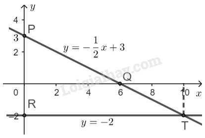 – Quan sát hình vẽ, ta thấy hai đường thẳng \(y = \displaystyle – {1 \over 2}x + 3\) và \(y = -2\) cắt nhau tại điểm \(T (10;-2).\)