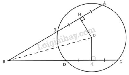 Cho đường tròn \((O)\) có các dây \(AB\) và \(CD\) bằng nhau, các tia \(AB\) và \(CD\) cắt nhau tại điểm \(E\) nằm bên ngoài đường tròn. Gọi \(H\) và \(K\) theo thứ tự là trung điểm của \(AB\) và \(CD\). Chứng minh rằng: