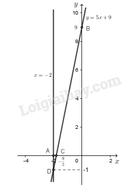 – Quan sát hình vẽ, ta thấy hai đường thẳng \(x = -2\) và \(y = 5x + 9\) cắt nhau tại điểm \(D (-2;-1).\)