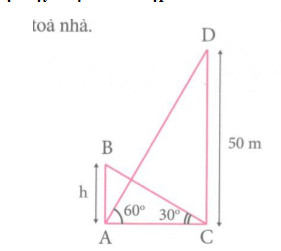 Từ chân một cái tháp cao 50 m người ta nhìn thấy đỉnh một tòa nhà với góc nâng \({30^o}\). Trong khi đó từ chân tòa nhà lại nhìn thấy đỉnh tháp với góc nâng \({60^o}\). Tính chiều cao của tòa nhà.