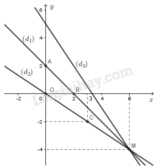 Hỏi đường thẳng \(\left( {{d_3}} \right):3x + 2y = 10\) có đi qua giao điểm của \(\left( {{d_1}} \right)\) và \(\left( {{d_2}} \right)\) hay không?