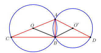 Cho hai đường tròn (O ; R) và (O’ ; R’) cắt nhau tại A và B với R > R’. Vẽ các đường kính AOC và AO’D. Chứng minh rằng ba điểm B, C, D thẳng hàng.