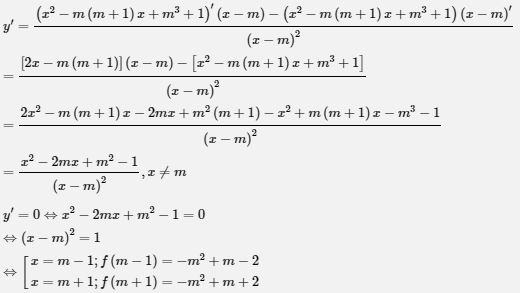 Chứng minh rằng với mọi giá trị của \(m\), hàm số: \(y = {{{x^2} – m\left( {m + 1} \right)x + {m^3} + 1} \over {x – m}}\) luôn có cực đại và cực tiểu.