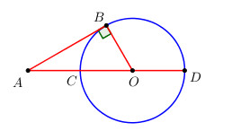 Từ một điểm A ở bên ngoài đường tròn (O) ta vẽ tiếp tuyến AB và cát tuyến ACD đi qua tâm O (C nằm giữa A và D). Giả sử số đo của cung nhỏ BC bằng \({50^o}\) , hãy tính số đo góc A.