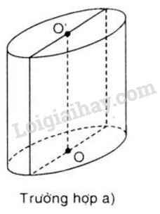 Một mặt phẳng chứa trụ \(OO’\) của một hình trụ; phần mặt phẳng nằm trong hình trụ là một hình chữ nhật có chiều dài \(3cm\), chiều rộng \(2cm.\) Tính diện tích xung quanh và thể tích hình trụ đó.