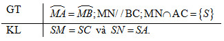 Mà \(\overparen{NC}=\overparen{MB}\) vì \(MN//BC \Rightarrow \) \(\widehat {NMC} = \widehat {MCB}\)