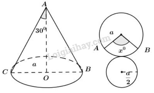 Khi quay tam giác vuông để tạo ra một hình nón như hinh 87 thì góc \(CAO\) gọi là nửa góc ở đỉnh của hình nón. Biết nửa góc ở đỉnh của một hình nón là  \(30^0\), độ dài đường sinh là \(a\). Tính số đo cung của hình quạt khi khai triển mặt xung quanh của hình nón.